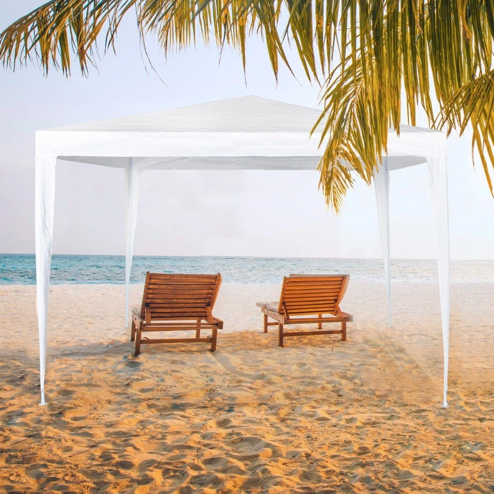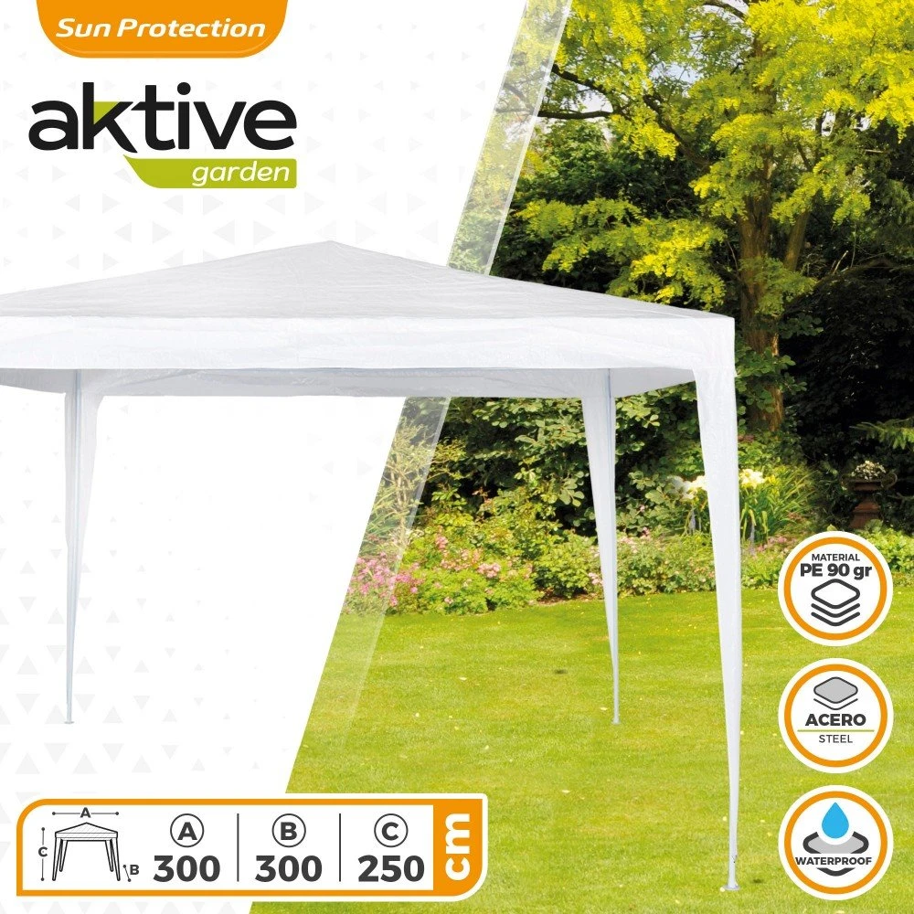 Cenador de polietileno 90 gr Aktive Garden. Crea un rincón de lo más acogedor en tu jardín o terraza con esta carpa en blanco de 300 x 300 x 250 cm. Tiene estructura metálica de acero de 0,35 mm de grosor y tubos de 24 y 18 mm de diámetro que se ensamblan entre sí. La lona es de plástico, resistente al agua e impermeable. Montaje sin herramientas en 10 minutos. Se ha diseñado para espacios exteriores.
