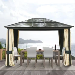 Pabellón de jardín. Prepara tu jardín para el verano y equípalo con este elegante pabellón. Gracias al tamaño grande, un juego de muebles cabe fácilmente debajo de las cortinas, protegiendo a todos del sol o la lluvia. Hecho de tela de poliéster de fácil cuidado, requiere poco mantenimiento. Es resistente a los rayos UV y a la intemperie, lo que lo convierte en un complemento perfecto para cualquier jardín. El color beige, combinado con un marco de metal en negro, permite colocarlo en una variedad de espacios, desde retro hasta moderno. Detalles: Tipo de Producto: Pabellón de jardín Estilo: Moderno Color: Beige Tipo de material: Acero Material principal: Acero Material adicional: Poliéster Composición del Material: 100% Poliéster Forma: Hexagonal Acabado: Revestimiento en polvo Placas: No Dimensiones: Profundidad: 350 cm Ancho: 350 cm Altura: 270 cm Peso: 25 kg La oferta incluye: 1 x Pabellón de jardín, Clavijas incluidas Ventajas: Se puede montar con clavijas, no se requieren cimientos, 6 cortinas con prácticas cremalleras, Perfecto para todo tipo de exterior, Materiales de la más alta calidad, Estructura duradera y sólida, Resistencia UV 4 (ISO 105-B02, UPF 30+ (filtra el 96,7% de la radiación UV Información de montaje: Requiere montaje completo. Más de 60 min. Información adicional: Por razones de seguridad, el pabellón debe quedar bien fijado al piso. El set incluye los accesorios necesarios para este propósito. Los elementos de fijación para otras superficies no están incluidos. Texto de resistencia: Gracias a su resistencia al agua, puedes utilizar el producto al aire libre y dejarlo a la intemperie durante lluvias ligeras. Si no es posible guardarlo en un lugar cerrado y protegido, recomendamos utilizar una funda protectora. La exposición prolongada a la humedad puede provocar daños en el mueble. Resistencia: Agua ligera / humedad Consejos de mantenimiento: Acero: 1.Los muebles de acero y sus elementos no deben exponerse al agua. De lo contrario, existe la posibilidad de que el agua oxidada salga de las tuberías del marco 2.Cuando no estén en uso, los muebles deben guardarse en el interior o bajo una cubierta protectora 3.Para aumentar la durabilidad del artículo, manténgalo seco y recuerde la limpieza regular 4.Cualquier daño a la capa de pintura exterior debe protegerse de la humedad 5.Para garantizar la protección contra la corrosión, evite los limpiadores alcalinos o ácidos. Después de limpiar, secar bien 6.Quite las tapas protectoras con regularidad para que salga todo el líquido, déjelas secar y utilice un spray anticorrosión si es necesario 7.Limpiar con detergentes suaves. Poliéster: 1.Lavar a mano únicamente, usar agua fría y un detergente suave 2.Cuando no esté en uso, manténgalo en un lugar limpio y seco para protegerlo de las condiciones atmosféricas 3.No secar en secadora ni planchar.