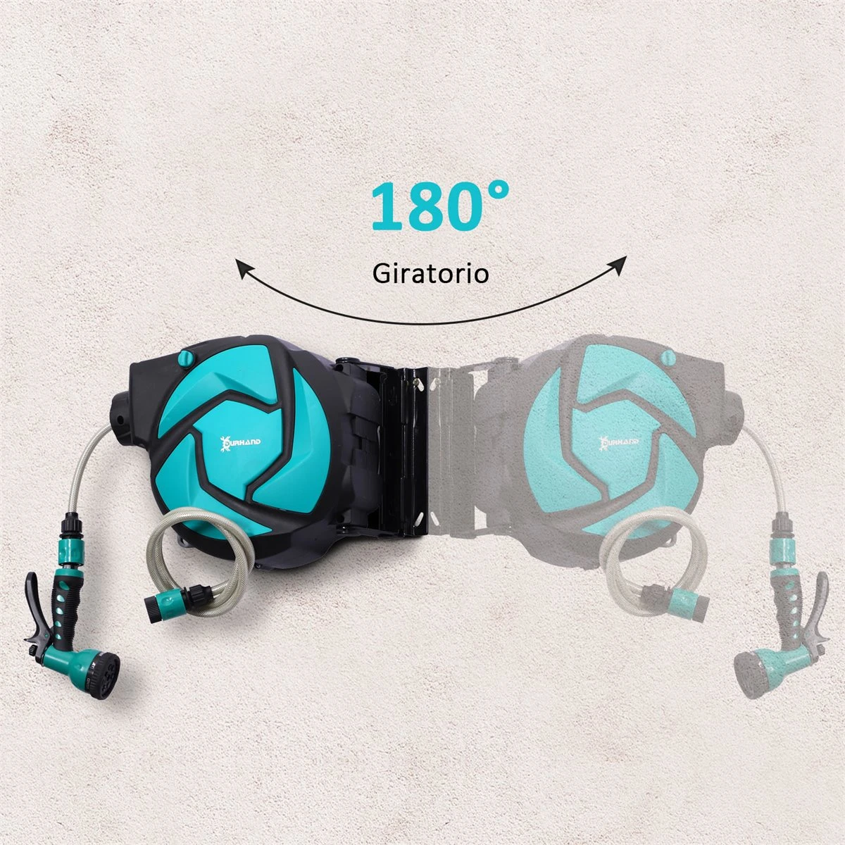 - – MULTIUSO Y RETRÁCTIL: Ideal para uso doméstico y comercial. Riega de manera fácil y eficiente tu jardín, césped, patio, balcón, vehículo, etc. con esta manguera retráctil de 10 metros de longitud, con enrollado automático – SISTEMA DE ENROLLADO: El sistema de enrollado permite que la manguera se enrolla de forma automática, lo que es lento y suave para evitar lesiones. Y también puedes fijarla mediante bloqueo para bloquearla a una longitud determinada – CARRETE 180º FIJADO EN LA PARED: Aunque podrías usarlo sin fijar, lo apropiado es fijar el carrete en la pared mediante los tornillos y tacos proporcionados. Su instalación va a permitir su buena funcionalidad, y, además, su soporte permite girar el carrete con la manguera 180º – 7 MODOS DE RIEGO: Riega de 7 modalidades distintas, como chorro, neblina, ducha, cónica, etc., para escoger la más adecuada según la situación, uso y alcance que quieras darle – MEDIDAS TOTALES: 28x14x34 cm (LxANxAL; Longitud de la manguera: 10 m. Incluye soporte de montaje giratorio de 180 grados, tornillos y tacos de pared