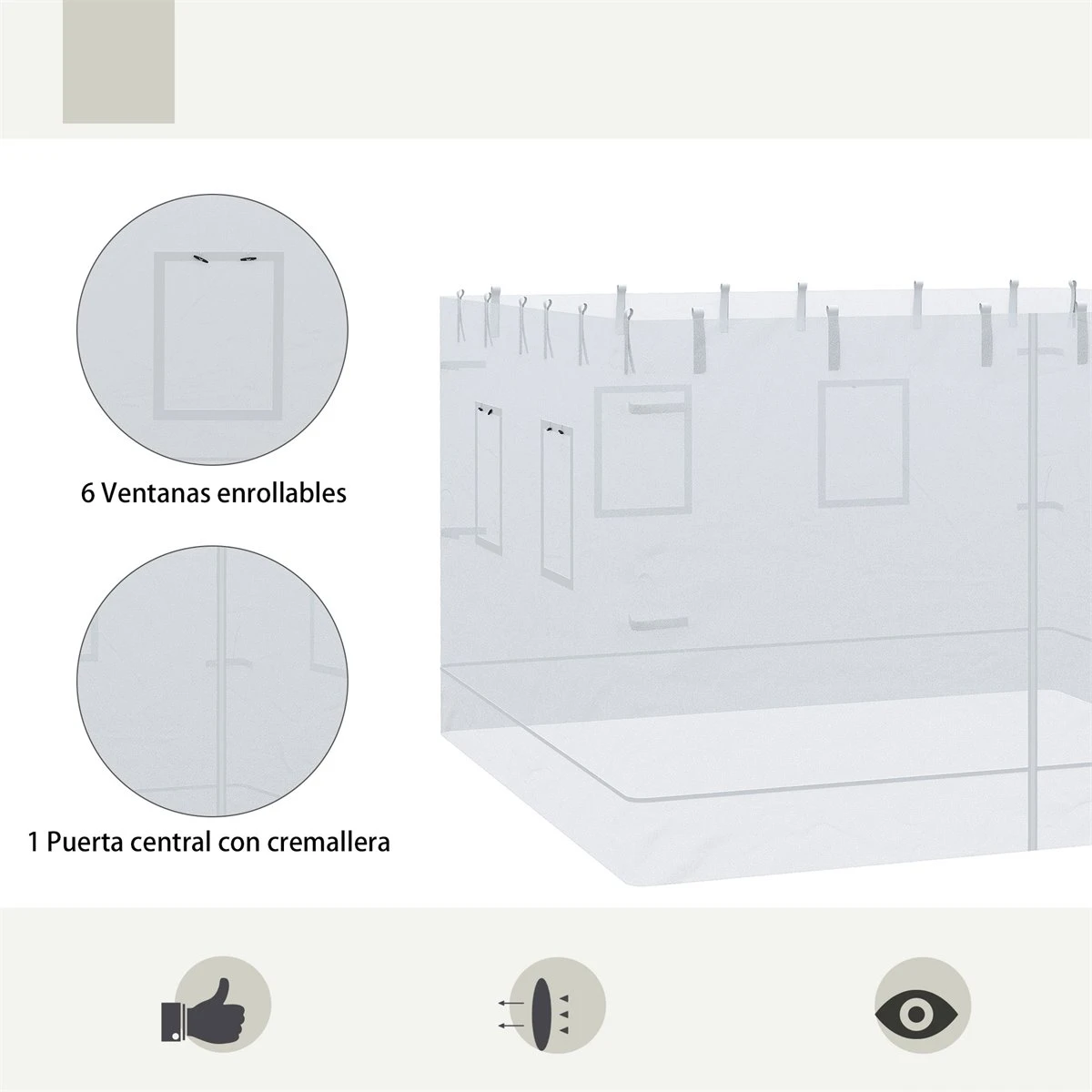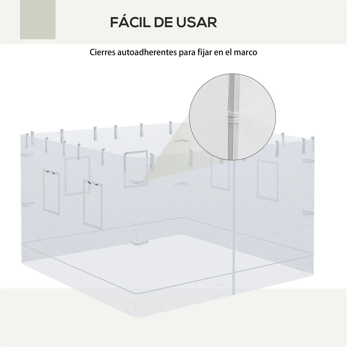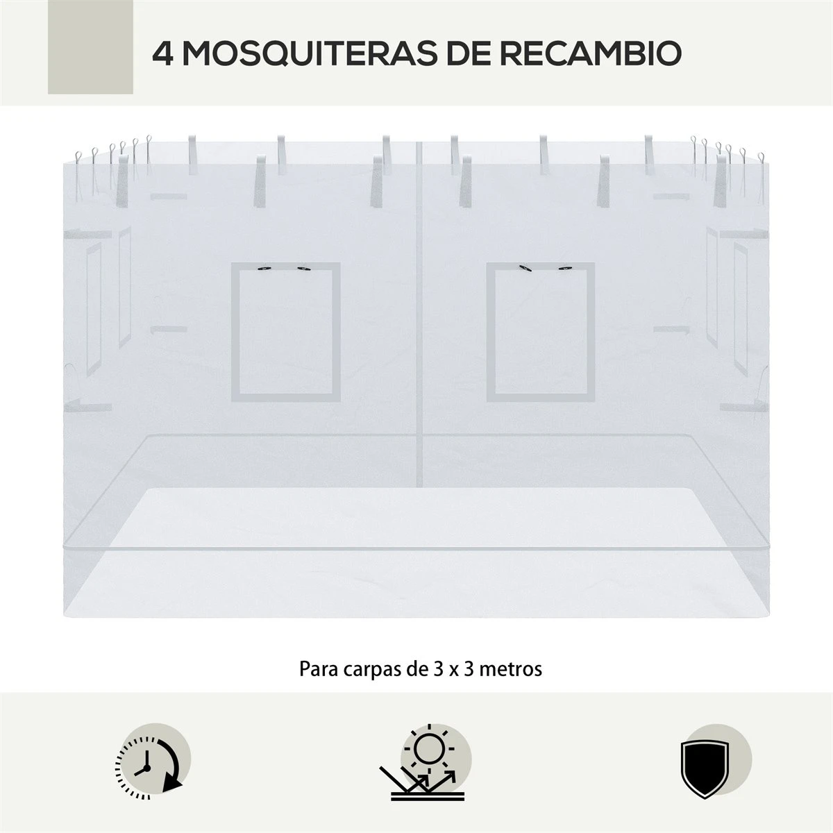 ¿Tienes un cenador de jardín, pero con una mosquitera rota o dañada? Entonces estás de suerte, porque Outsunny ofrece mosquiteras de reemplazo que se adaptan a la mayoría de carpas de 3×3 metros. Hechas de tela de poliéster lista para usar, la mosquitera protege tu espacio privado de los insectos, hojas y escombros. Cada panel se monta tan fácilmente como una cortina de baño y puedes guardarlos y transportarlos fácilmente en la bolsa de dos asas que se incluye. Características: Diseñadas para adaptarse a carpas con toldo emergente de 3 x 3 (m con aleros de 200 ± 5 cm Las mosquiteras mantienen alejados a los mosquitos y otros intrusos no deseados Este conjunto consta de 3 mosquiteras con 2 ventanas cada una, y una mosquitera con puerta con cremallera Fácil de instalar como si fuese una cortina y con velcro para fijar en los laterales Incluye bolsa de viaje para un fácil almacenamiento y transporte Especificaciones: Color: blanco Material: malla de nailon Medidas de un solo panel: 300×195 cm (LxAL Medidas de la bolsa de transporte: 35x28x12 cm (LxANxAL Medidas de las ventanas: 58×50 cm (LxAL Referencia: 84C-410V00WT
