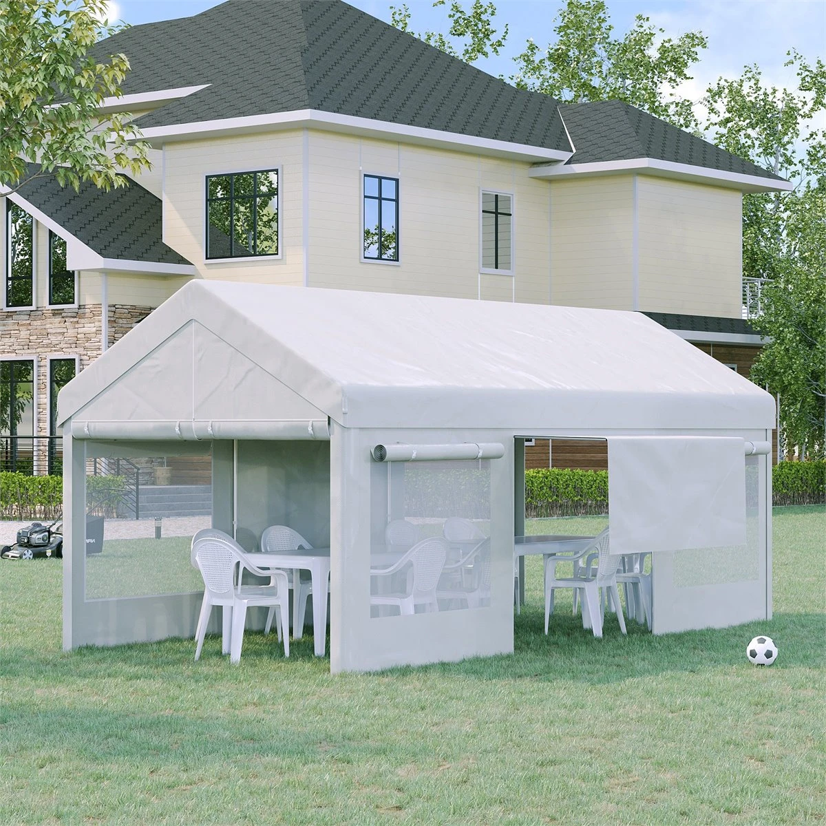¿Estás planeando una actividad o evento al aire libre? Una carpa es esencial en todas las estaciones del año. En verano para protegerse del sol, en otoño o invierno del frío y en cualquier estación del viento y la lluvia. Además, esta carpa de Outsunny cuenta con marco de acero galvanizado, toldo de tejido PE resistente a los rayos UV y paredes laterales extraíbles. Características – Las ventanas con malla anti-insectos ofrecen una buena visibilidad y circulación de aire – Cuenta con 3 puertas de fácil acceso, 1 de las cuales se puede apoyar creando un pequeño avancé – Incluye 4 cuerdas de tracción, 16 piquetas en forma de L y 4 piquetas en espiral para mayor estabilidad – NOTA: No utilizar en condiciones meteorológicas extremas como viento fuerte, lluvia fuerte, nieve, granizo, etc. – Requiere montaje Especificaciones – Color: blanco – Material: PE, acero y nailon – Medidas totales: 600x295x285 cm (LxANxAL – Altura del alero: 202 cm – Medidas de la puerta: 260×190 cm (delantera y trasera y 200×185 cm (lateral – Medidas de las ventanas: 142×124 cm (LxAN – Medidas de la pared lateral: 595×198 cm (derecha/izquierda – Nivel de resistencia al viento: 4 – Capacidad de carga de nieve: 5 kg/㎡ – Referencia: 84C-376V00WT – NOTA: No utilizar en condiciones meteorológicas extremas como viento fuerte, lluvia fuerte, nieve, granizo, etc.