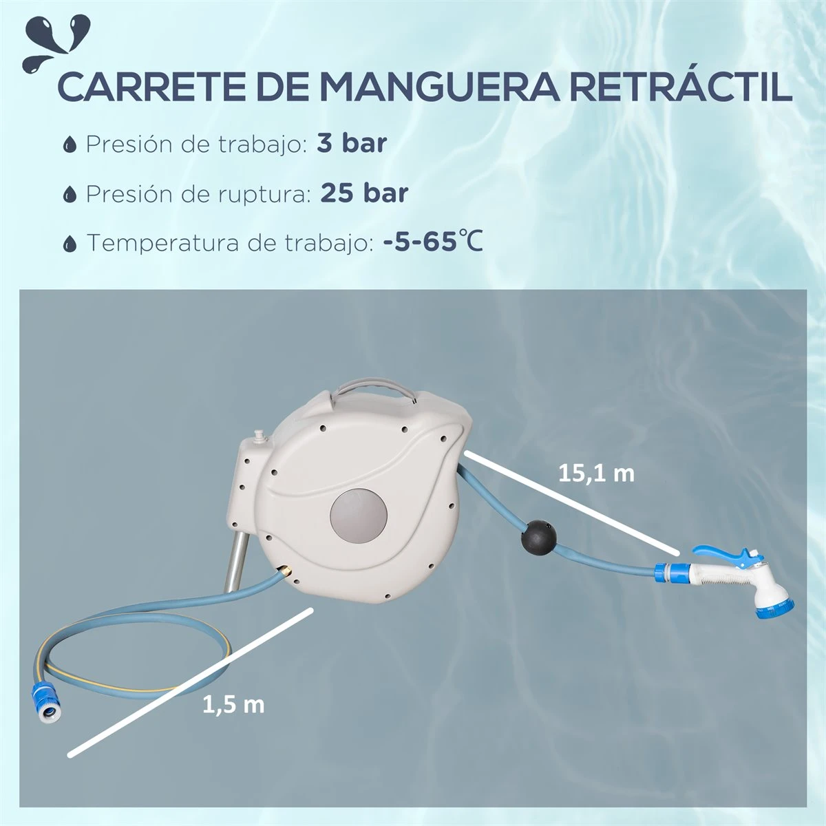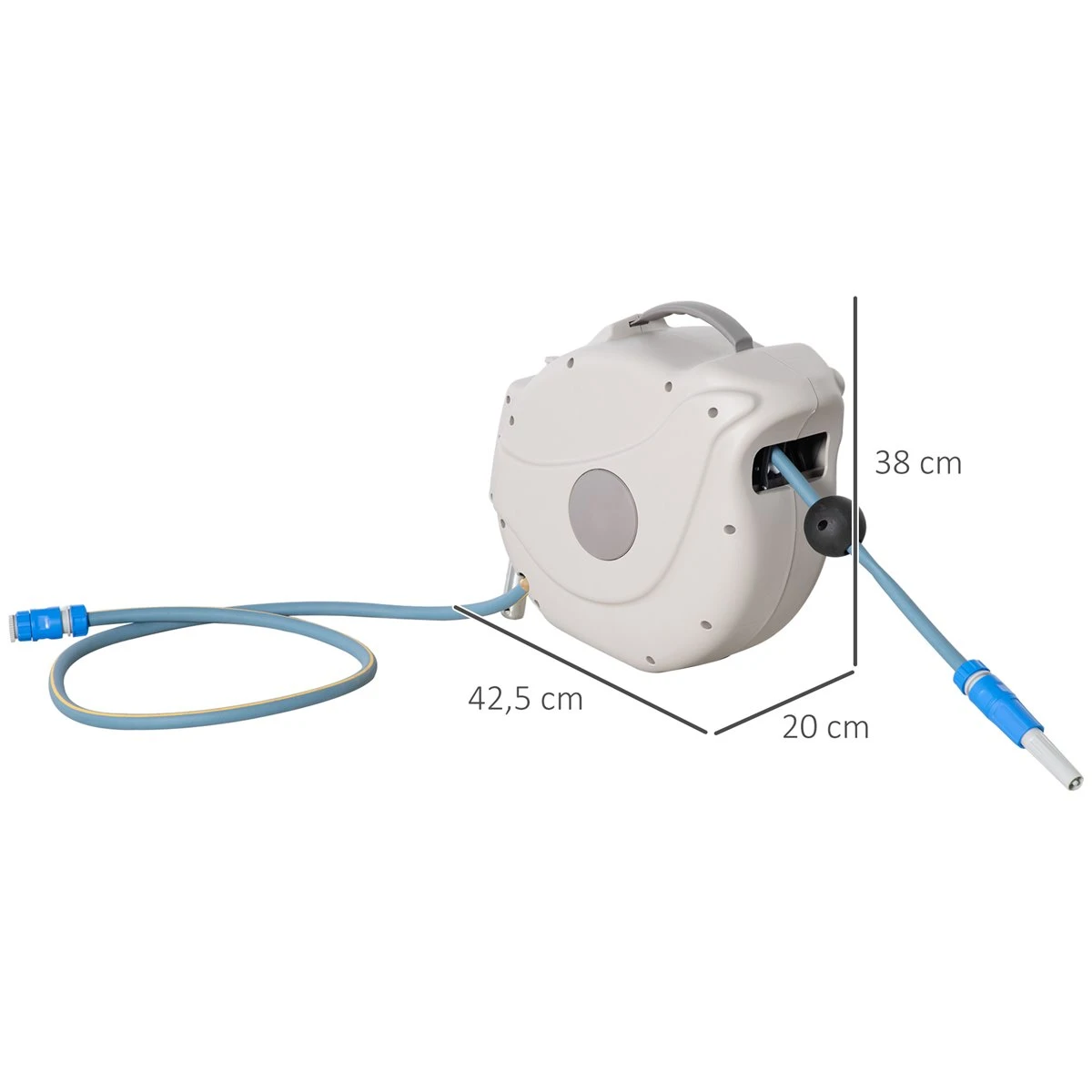 Si quieres una manguera para tu patio o jardín y no quieres estar pendiente de que se tuerza, enrolle, etc. y tener que enrollarla cuando terminas, este carrete de manguera retráctil de Outsunny es lo que necesitas. Cuenta con una manguera de 15,1 m que se enrolla automáticamente con bloqueo para fijarla en cualquier posición. Ideal para regar tus plantas, césped, limpiar tu patio, coche y más. Características – La manguera de agua de 15 metros de longitud ofrece una gran amplitud de trabajo y libertad de movimiento – Carrete de polipropileno de alta calidad, resistente a impactos y a la intemperie – Sistema de enrollado automático para mayor durabilidad y comodidad de uso – Viene con 2 cabezales intercambiables, uno tipo ducha y el otro de llenado y riego tradicional – El cabezal tipo ducha tiene 8 modos diferentes de rociado – Excelente para regar jardines, césped, patios, limpieza de vehículos y más – Incluye soporte de montaje giratorio de 180 grados y accesorios – Se requiere montaje – NOTA: Antes de recoger la manguera dentro del carrete, asegúrese de que no gotee. Guarde la manguera y el carrete en el interior durante los meses de invierno para prolongar su vida útil Especificaciones – Color: gris – Material: plástico PP (carrete y PVC (manguera – Medidas totales: 42,5x20x38 cm (LxANxAL – Longitud de la manguera de agua: 15,1 m – Diámetro de la manguera de agua: 15,5 mm – Longitud de la manguera de conexión: 1,5 m – Presión de trabajo: 3 bar – Presión de rotura: 25 bar – Temperatura de trabajo: -5-65 ℃ – Conector rápido: Ø8,76 mm – Referencia: 845-731