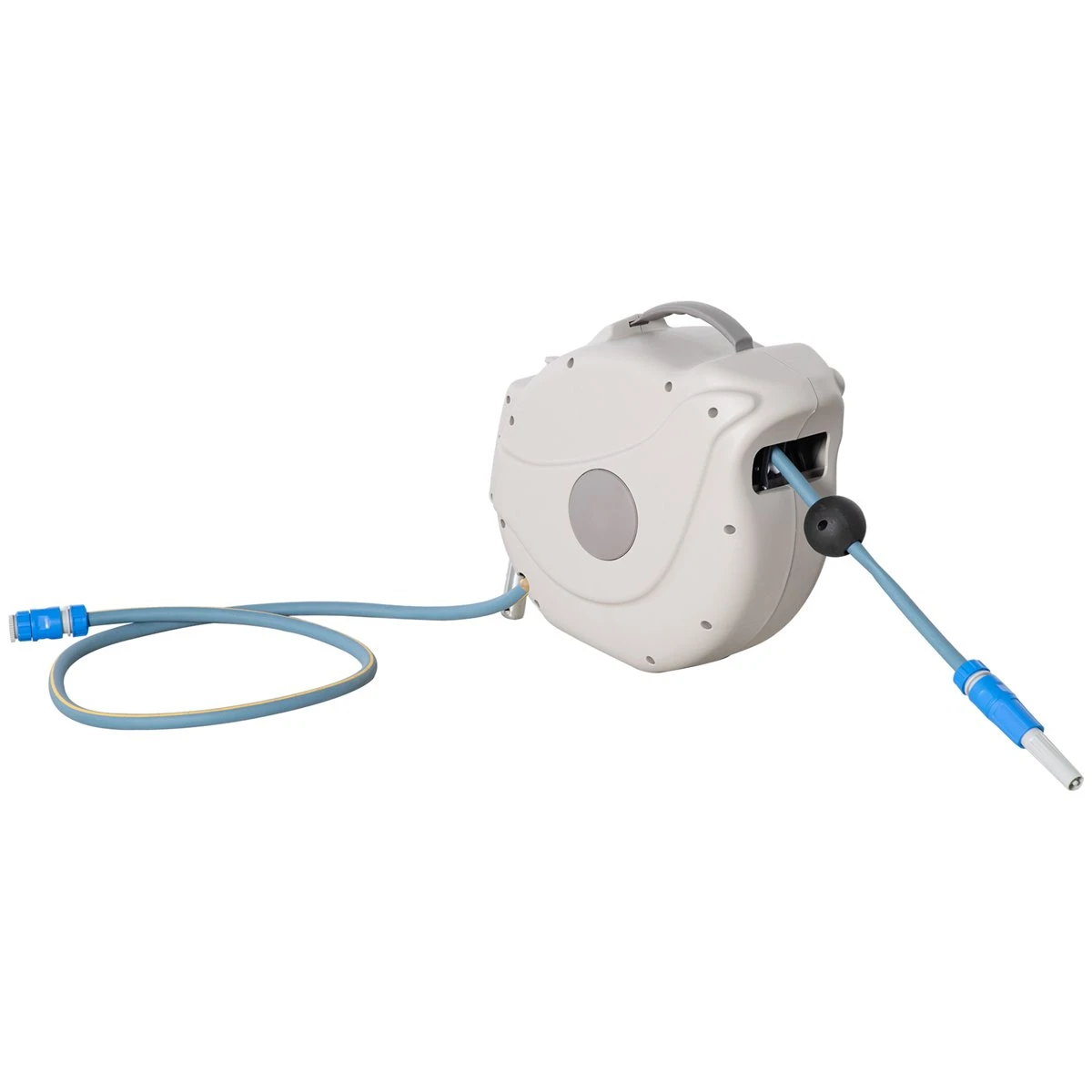 - – CARRETE DE MANGUERA MULTIUSOS: Riega de manera fácil y eficiente tu jardín, césped, patio, balcón, lava tu coche, ducha a tu mascota, limpia el suelo de tu terraza, etc. con esta manguera retráctil de 15,1 metros de longitud, con enrollado automático – RETRÁCTIL Y BLOQUEABLE: Este carrete con manguera de agua de 15,1 m tiene una función de bloqueo para que puedas fijar la manguera a cualquier longitud tirando de ella. De este modo podrás extenderla a la medida justa y no tener la manguera con enredos por el suelo – 2 CABEZALES Y 10 MODOS DE PULVERIZACIÓN: Esta manguera viene con dos cabezales distintos. Uno de ellos dispone de dos posiciones, pulverización directa y ducha, y la otra dispone de 8 modalidades distintas de rociado, para que puedas escoger la más adecuada según la situación, uso y alcance que quieras darle – MONTADO EN LA PARED O PORTÁTIL: El soporte de montaje en la pared viene con todos los accesorios necesarios para su montaje, y además permite girar el carrete 180º. Se puede utilizar de dos formas, fijado a la pared o utilizando el asa para desmontarlo de la pared y llevarlo donde quieras – MEDIDAS TOTALES: 42,5x20x38 cm (LxANxAL. Manguera de conexión: 1,5 m. Longitud de la manguera: 15,1 m. Requiere montaje