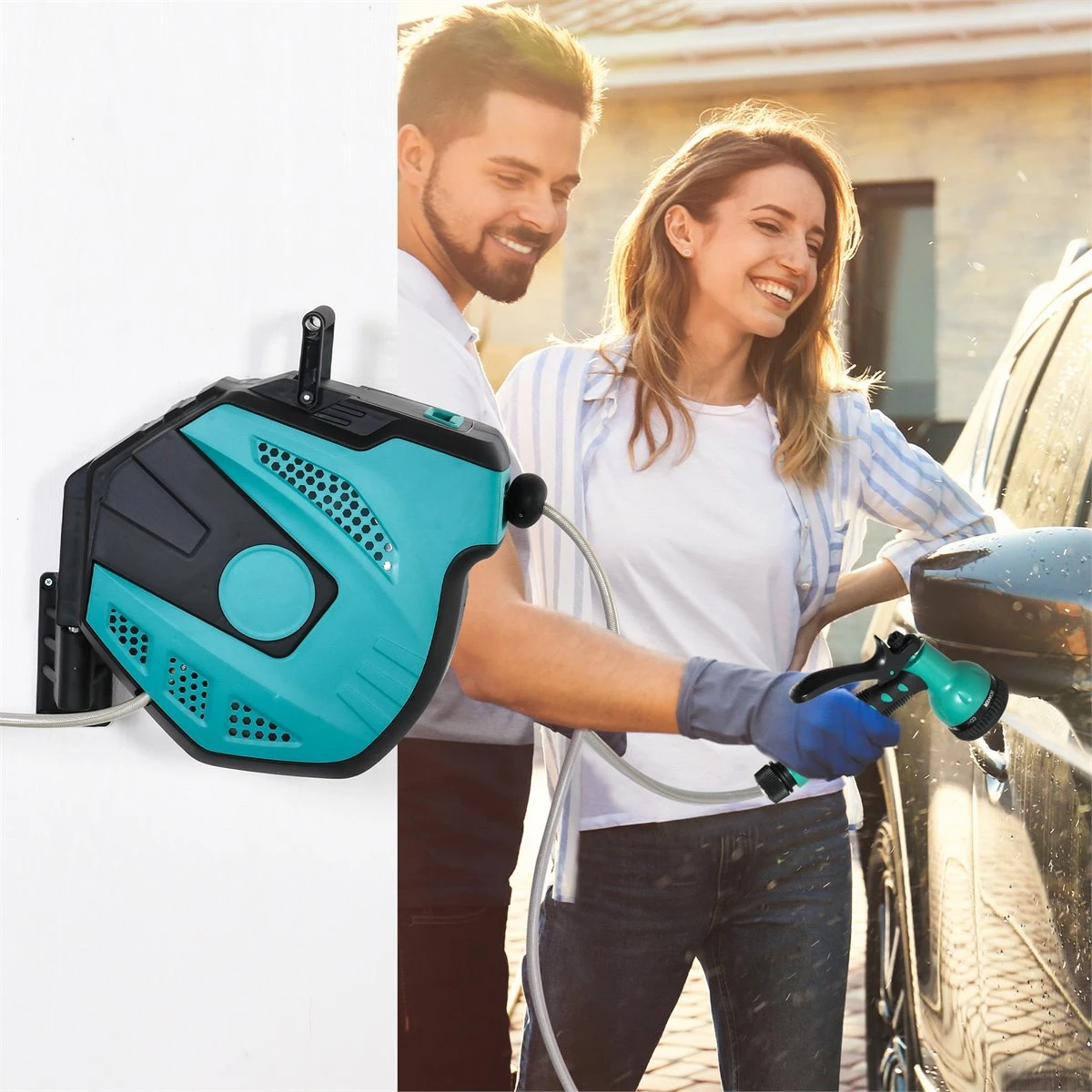 - – MULTIUSO: Riega de manera fácil y eficiente tu jardín, césped, patio, balcón, etc. Perfecta también para el lavado de coches, bañar a tu perro o cualquier otra mascota, limpiar las losetas del camino de entrada a tu casa y más – RETRÁCTIL Y BLOQUEABLE: Este carrete con manguera de agua de 20 m, cuenta con función de bloqueo para poder fijar la manguera en cualquier longitud tirando de ella. Después de su uso, se debe de tirar de la sección corta para realizar la recuperación automática – CARRETE 180º FIJADO EN LA PARED: Aunque podrías usarlo sin fijar, lo apropiado es fijar el carrete en la pared con los accesorios de montaje incluidos. Su instalación va a permitir su buena funcionalidad, y, además, su soporte permite girar el carrete con la manguera 180º – 7 MODOS DE RIEGO: Riega de 7 modalidades distintas, como chorro, neblina, ducha, cónica, etc. Tanto si necesitas un chorro de alta presión para una superficie dura o una ducha suave para tu mascota, estos 7 modos ajustables proporcionan una adecuada presión de agua para cada necesidad – MEDIDAS TOTALES: 52x43x24 cm (LxANxAL. Manguera de conexión: 1,95 m. Longitud de la manguera: 20 m. Incluye soporte de montaje giratorio de 180 grados y tornillos