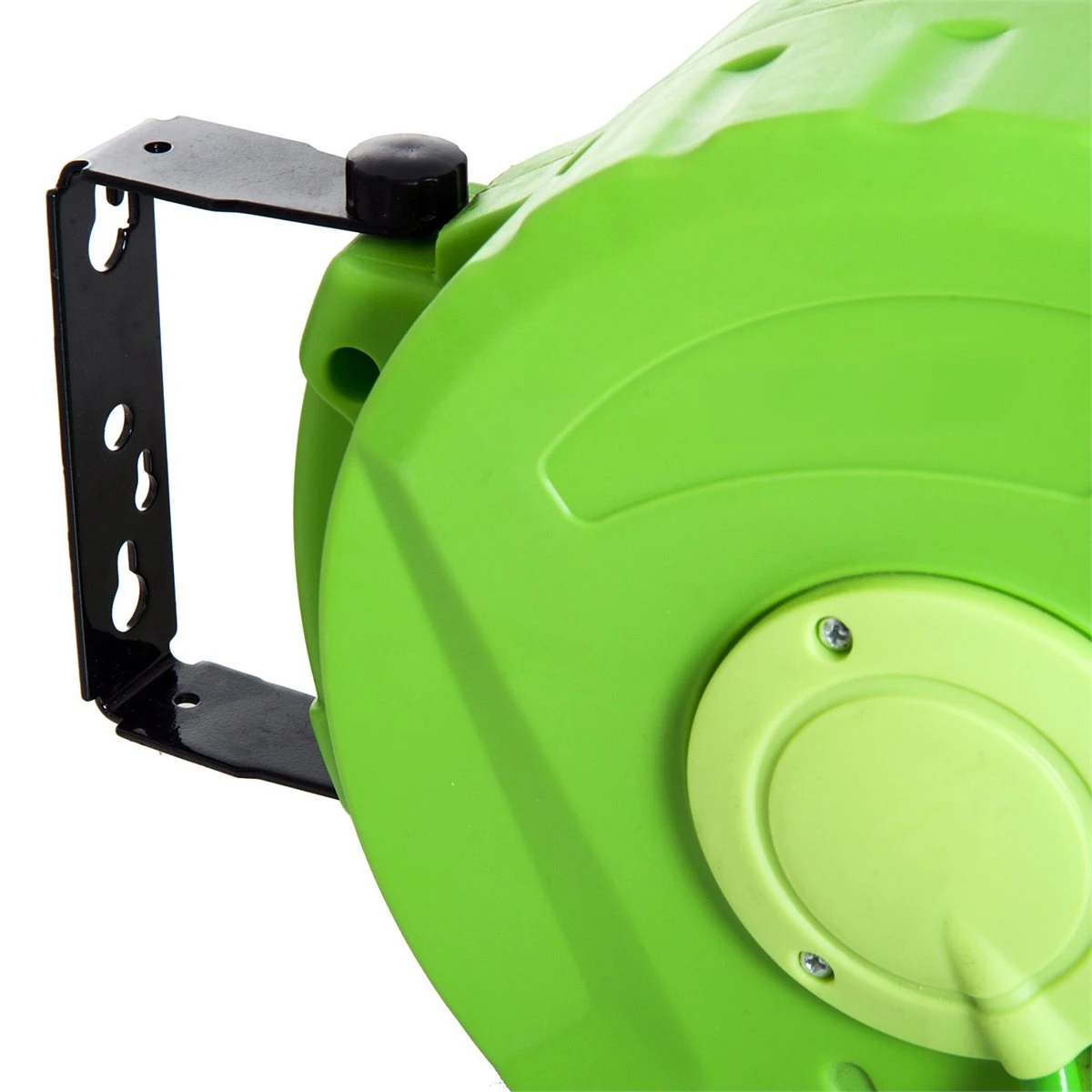Este carrete para manguera tiene una gran variedad de aplicaciones domésticas: se puede usar para el riego de jardines y flores, para la limpieza del hogar y también para limpiar tus vehículos. Este dispositivo está fijado en la pared y utiliza una tubería de agua retráctil, muy estable y práctico. Permite una rotación de 180 grados, de modo que puede aumentar la cobertura de riego. Está hecho de materiales de alta calidad para garantizar el uso a largo plazo en exteriores. Se enrolla de forma fácil y automática sin ocupar espacio ¡Es una gran solución para evitar los nudos y el desorden de las mangueras tradicionales! Características – Carrete portamanguera muy útil con 10m de manguera y 1m de cable de conexión – Ideal para el riego de jardín, limpieza doméstica, limpieza de vehículos, etc. – La manguera se bloquea con una bola que puede fijarse en cualquier longitud – Ángulo de rotación de 180 ° que amplía la cobertura de riego y ahorra espacio cuando se pliega – La fijación de pared es fácil de desmontar para proteger el producto cuando no esté en uso – Se enrolla automáticamente de forma ordenada y compacta – Cubierta de PP de alta calidad y manguera de PVC que garantiza la máxima resistencia – Fijación estable en la pared. Accesorios de fijación incluidos Especificaciones – Color: Verde Material: PP, PVC – Longitud de la manguera: 10m Longitud del cable conductor de 1m – Presión del agua: 8bar Presión máxima del agua: 24bar Temperatura recomendada: -5-45℃ – Dimensiones del paquete: 35,5×11,5×27,5 cm (LxANxAL – Peso bruto: 3.65 kg Referencia: 845-181