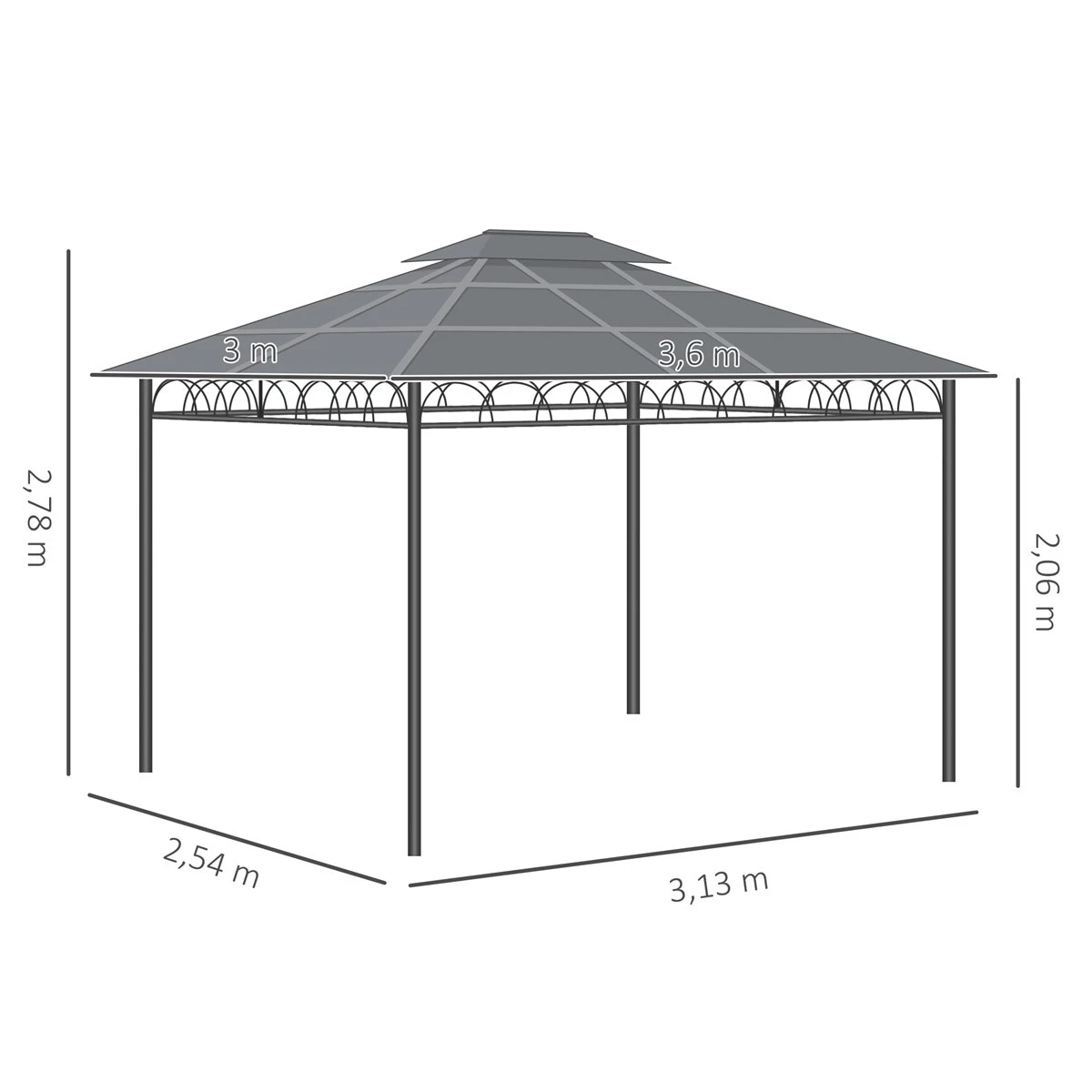 Elegancia y confort para tus reuniones con la familia y/o amigos. ¡Impresiona a tus invitados con esta pérgola de Outsunny! Su estructura resistente y techo doble de policarbonato llaman la atención a primera vista, pero lo mejor se esconde detrás de las múltiples opciones que sus laterales te permiten. Incluye cortinas opacas y también mosquiteras, para que puedas usar unas u otras, o tener ambas cerradas para ofrecer un espacio completamente abierto. ¡Es la solución perfecta para tu jardín! Características – Pérgola ideal para bodas, eventos al aire libre, cumpleaños y mucho más – Estructura de metal y aluminio para mayor resistencia y estabilidad – Incluye cortinas opacas de poliéster para mayor privacidad y también mosquiteras para mantener alejados a los insectos – El techo doble de policarbonato garantiza una buena circulación del aire y mayor protección contra los rayos UV – Incluye 8 estacas de suelo y 8 tornillos de expansión para fijar en el suelo mayor estabilidad – Perfecto para patios, jardines u otros espacios exteriores – Fácil de limpiar y mantener – Requiere montaje Especificaciones – Color: negro, gris oscuro y caqui – Material: aluminio, metal, placas de policarbonato, poliéster y nylon – Medidas totales: 360x300x278 cm (LxANxAL – Altura del alero: 206 cm – Espacio entre las columnas: 313×254 cm (LxAN – Referencia: 84C-364V02KK
