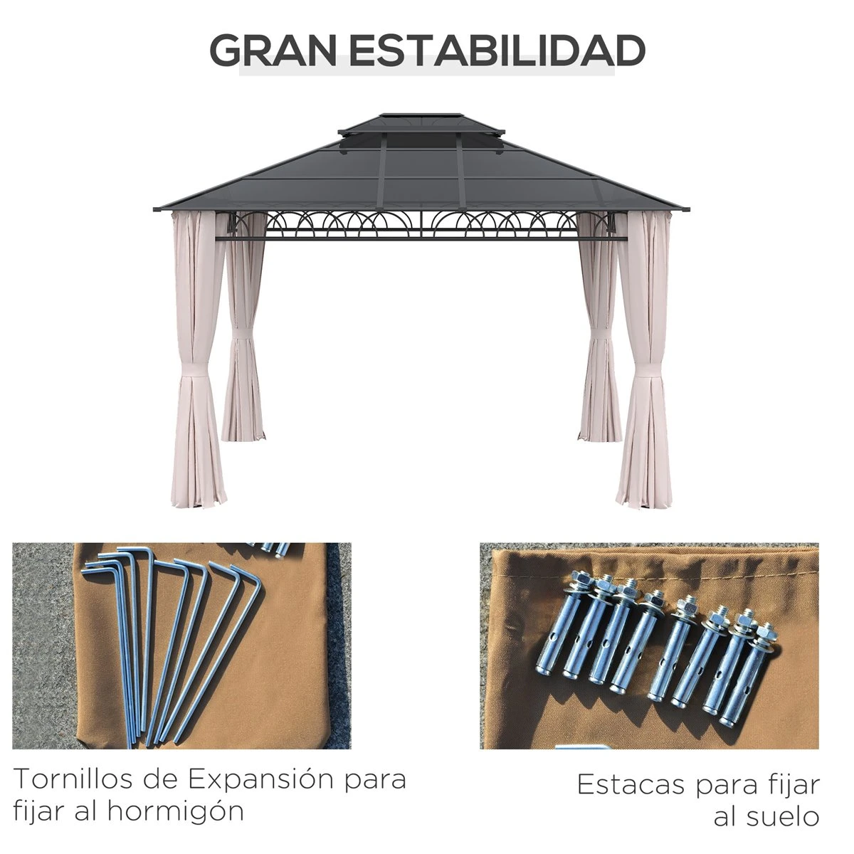 - – DOBLE TECHO DE POLICARBONATO: El techo de policarbonato de esta pérgola ofrece más protección que un toldo tradicional, protegiendo a sus invitados de la luz solar directa, los rayos UV y la lluvia de la forma más eficaz. Además, gracias a su diseño y combinación de colores, aportará un toque elegante a tu jardín – RESISTENTE Y ESTABLE: Pérgola con estructura de metal y aluminio para una mayor resistencia a la intemperie y al óxido. Además, incluye 8 estacas de tierra y 8 tornillos de expansión para mayor seguridad y estabilidad – CON CORTINAS Y MOSQUITERA: Esta pérgola tiene 3 opciones diferentes para los laterales. Puedes dejar las cortinas enrolladas y pegadas a los lados, utilizar las cortinas opacas para mayor privacidad o las mosquiteras para mantener alejados a los insectos mientras disfrutas de un día con tus amigos y familiares – GRAN ESPACIO: Con un amplio espacio, esta pérgola ofrece suficiente espacio para tus muebles de jardín. Es ideal para disfrutar de una buena comida en familia o tomar algo y charlar con los amigos – MEDIDAS TOTALES: 360x300x278 cm (LxANxAL. Altura del alero: 206 cm. Se requiere montaje