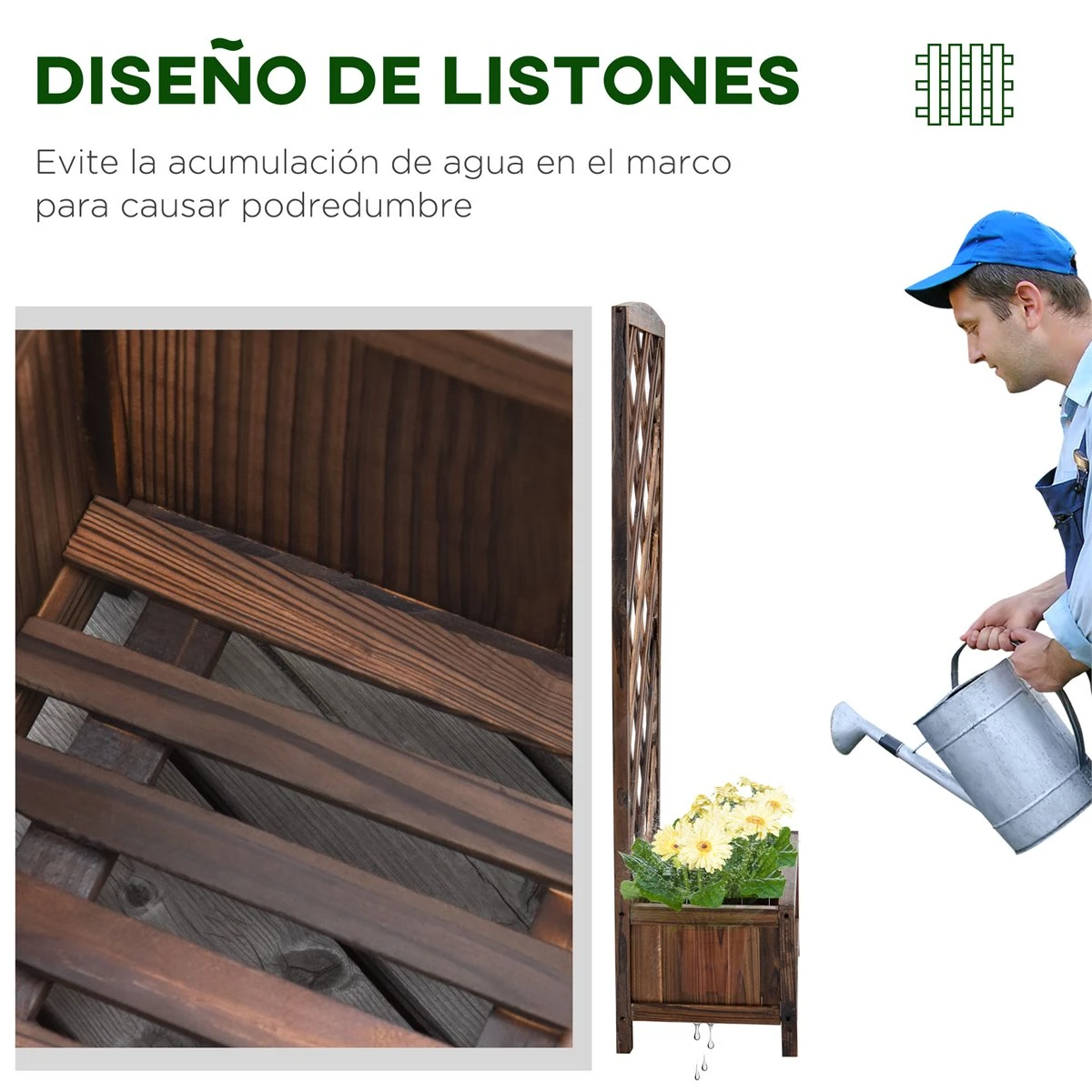 Dale a tus flores un bonito espacio para crecer y florecer con este soporte para plantas de Outsunny. Compuesto por una jardinera en la parte inferior y un enrejado alto para tus enredaderas o para colgar macetas pequeñas o adornos. Ideal para cultivar hierbas aromáticas o flores, este soporte para exteriores combinará perfectamente en cualquier entorno al aire libre. También lo puedes usar a modo de biombo para separar ambientes en tu jardín o terraza. Características – Jardinera con celosía con estructura resistente de madera de abeto – Conjunto decorativo ideal para tus plantas trepadoras y enredaderas o para colgar macetas – Diseño espacioso con una maceta grande y profunda en la parte inferior para cultivar flores, vegetales, plantas, etc. – Con gran capacidad de carga, la maceta puede soportar hasta 30 kilos de peso – Acabado de la madera carbonizado para darle un aspecto más rústico y elegante y mayor resistencia a elementos externos – Requiere montaje Especificaciones – Color: marrón carbonizado – Material: madera de abeto – Medidas totales: 60x30x122,5 cm (LxANxAL – Medidas de la jardinera: 60x30x25 cm (exterior, 53,5x24x16 cm (interior – Medidas del enrejado: 60×2,5×95 cm (LxANxAL – Carga máxima: 30 kg – Referencia: 845-388