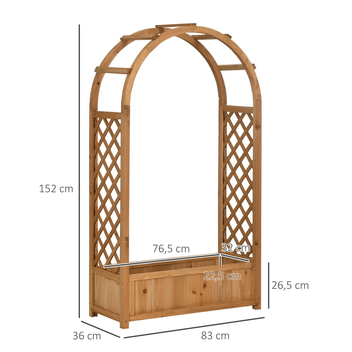 Esta jardinera de exterior de Outsunny añadirá un encanto natural a tu jardín. Esta jardinera de madera te permite dar la bienvenida a tus invitados con bonitas plantas, mientras que la parte superior del arco y el enrejado a ambos lados son adecuados para enredaderas y perfectos para decoraciones. Gracias a su diseño de líneas limpias, este enrejado arqueado es una gran decoración para añadir estilo al jardín. Características – Conjunto decorativo ideal para tus plantas trepadoras y enredaderas o para colgar macetas – Con arcón y celosía en ambos lados para poder tener enredaderas – Diseño espacioso con una maceta grande en la parte inferior para cultivar flores, vegetales, plantas, etc. – Fabricado en madera de abeto y diseñado para ser colocado en el exterior – Acabado con pintura al agua, apta para exteriores – Se puede decorar con flores vibrantes, globos de tul, luces y más elementos ligeros en fiestas y eventos – Se requiere montaje, se incluyen instrucciones Especificaciones – Color: marrón – Material: madera de abeto – Medidas totales: 83x36x152 cm (LxANxAL – Medidas de la jardinera: 35x83x26,5 cm (LxANxAL – Área de la plantación: 76,5x32x22,5 cm (LxANxAL – Altura de las patas: 5 cm – Carga máxima: 60 kg (área de cultivo – Referencia: 845-777V00BN