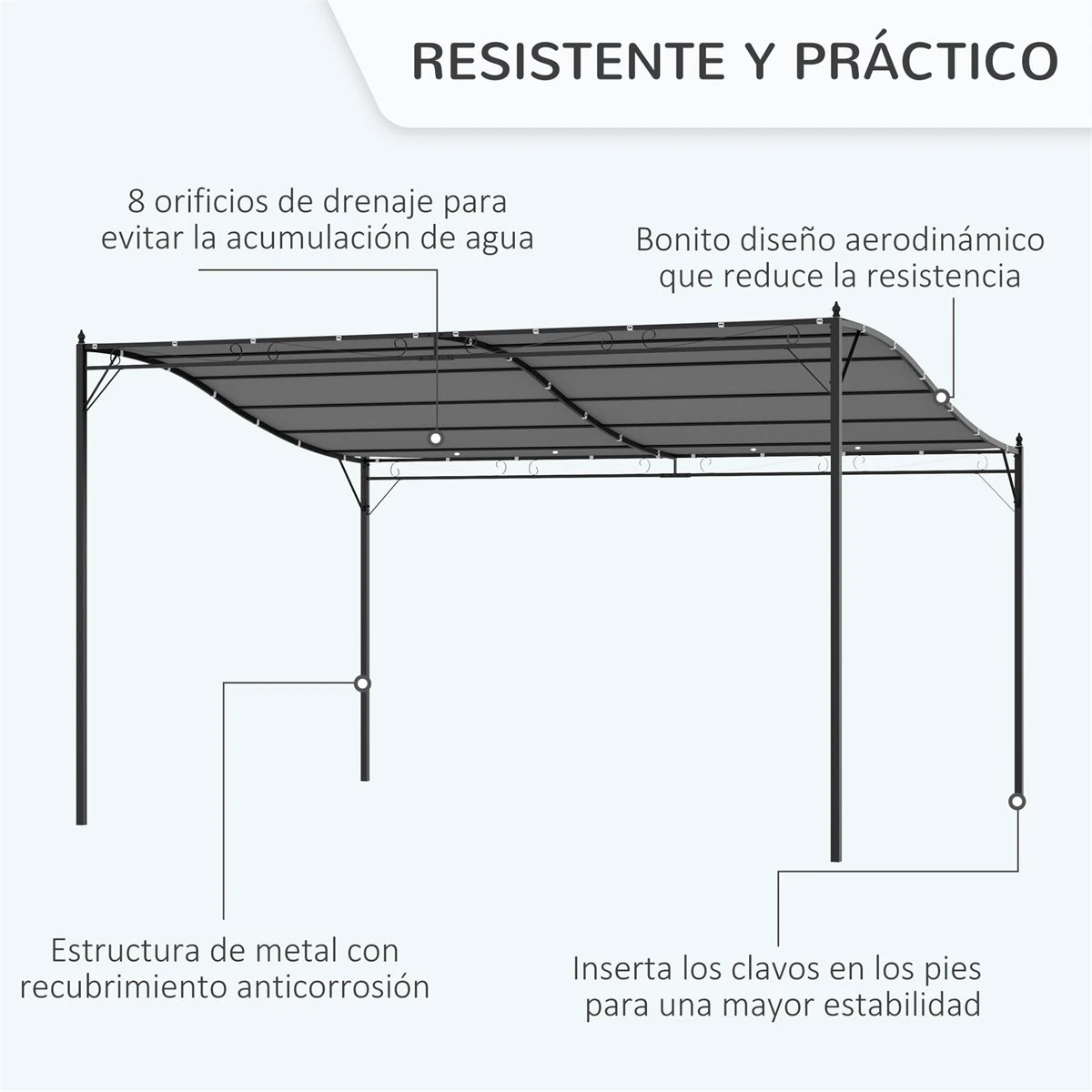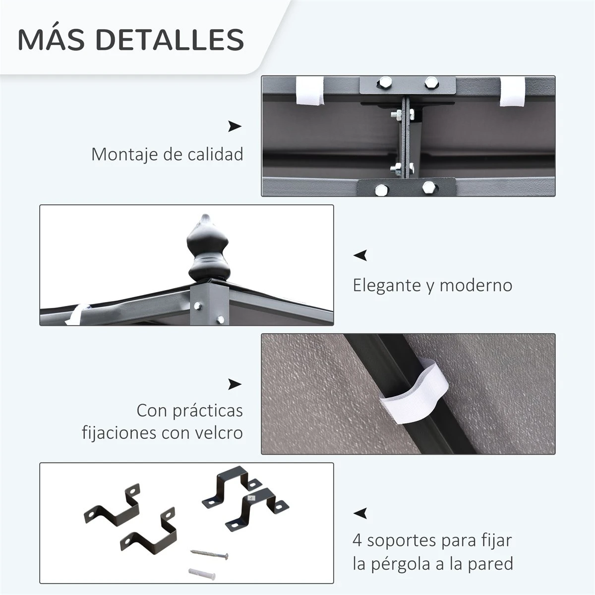 Nuestra pérgola de Outsunny de acero es ideal para jardín, terraza, patio, etc. El dosel del techo está hecho de poliéster con un revestimiento de PA resistente a la intemperie, a los rayos UV y al agua. Esta carpa se puede montar contra una pared cerca de una puerta o ventana, y ofrece la posibilidad de fijarla a la pared para mayor estabilidad. Su diseño elegante de techo curvo y onda decorativa combinará fácilmente en cualquier rincón de su hogar aportando elegancia.